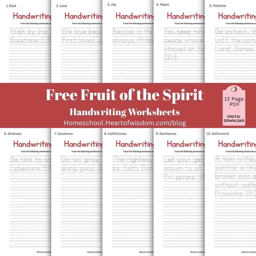 These ten free Fruit of the Spirit handwriting worksheets are inspired by Galatians 5:22–23, where God’s Word teaches that “the fruit of the Spirit is love, joy, peace, patience, kindness, goodness, faithfulness, gentleness, and self-control.” Each page highlights one of these beautiful virtues with a short Bible verse and matching fruit symbol—helping children learn Scripture while practicing handwriting.